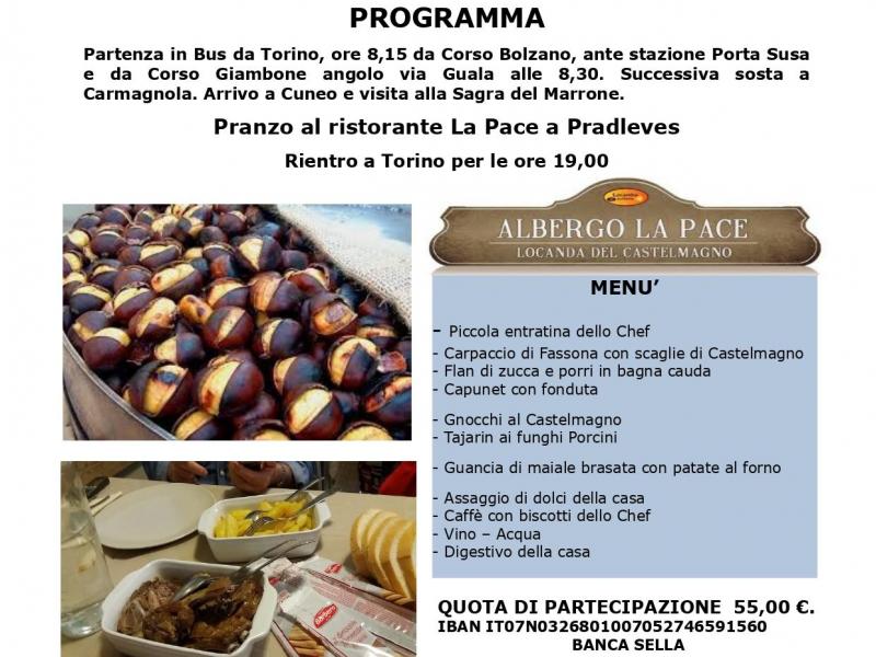 Il CRT FITeL Torino organizza una Gita Sociale a Cuneo in occasione della Fiera del Marrone PROGRAMMA Partenza in Bus da Torino, ore 8,15 da Corso Bolzano, ante stazione Porta Susa e da Corso Giambone angolo via Guala alle 8,30. Successiva sosta a Carmagnola. Arrivo a Cuneo e visita alla Sagra...