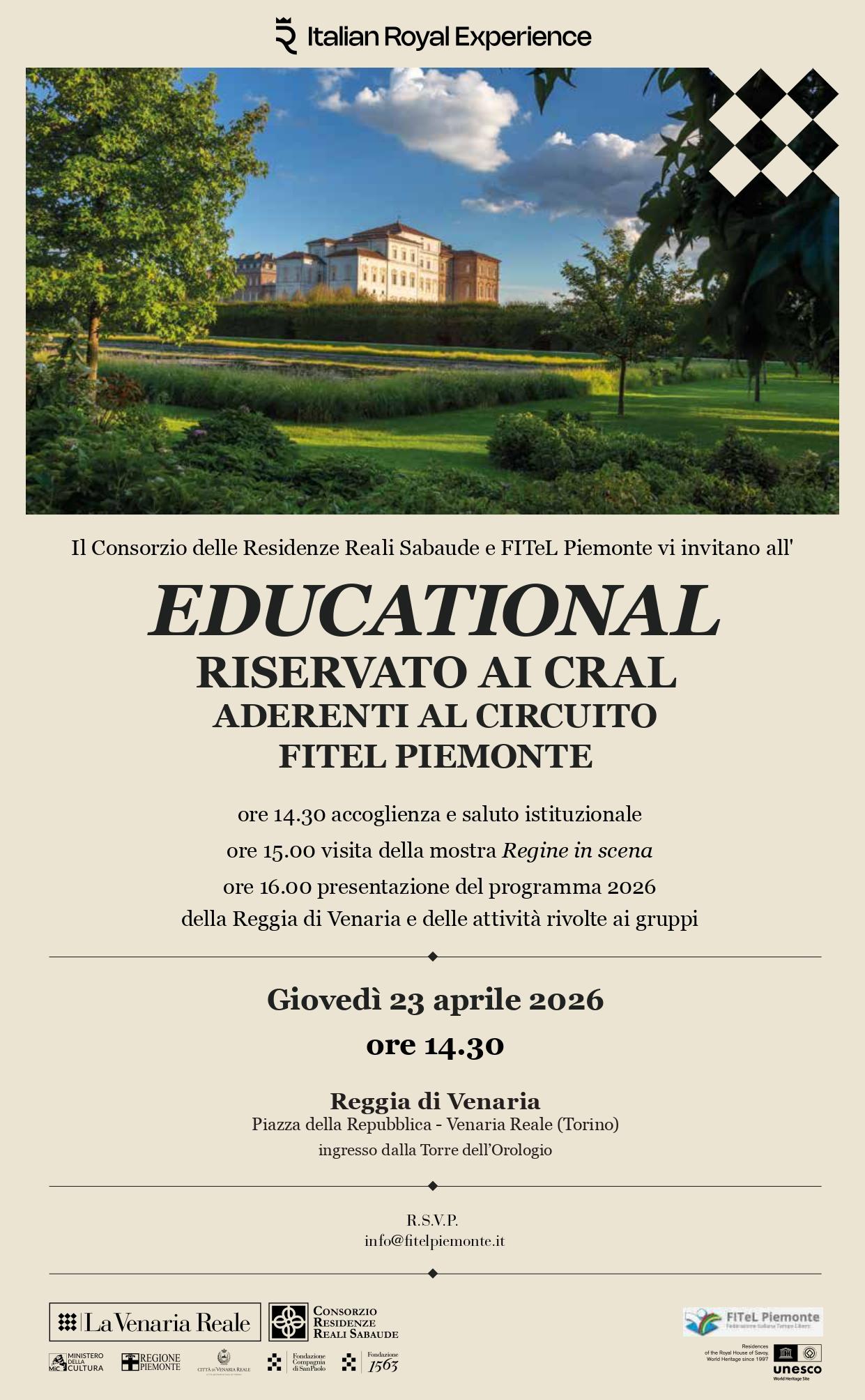 Il Consorzio delle Residenze Reali Sabaude e FITeL Piemonte vi invitano all' Educational alla Reggia di Venaria